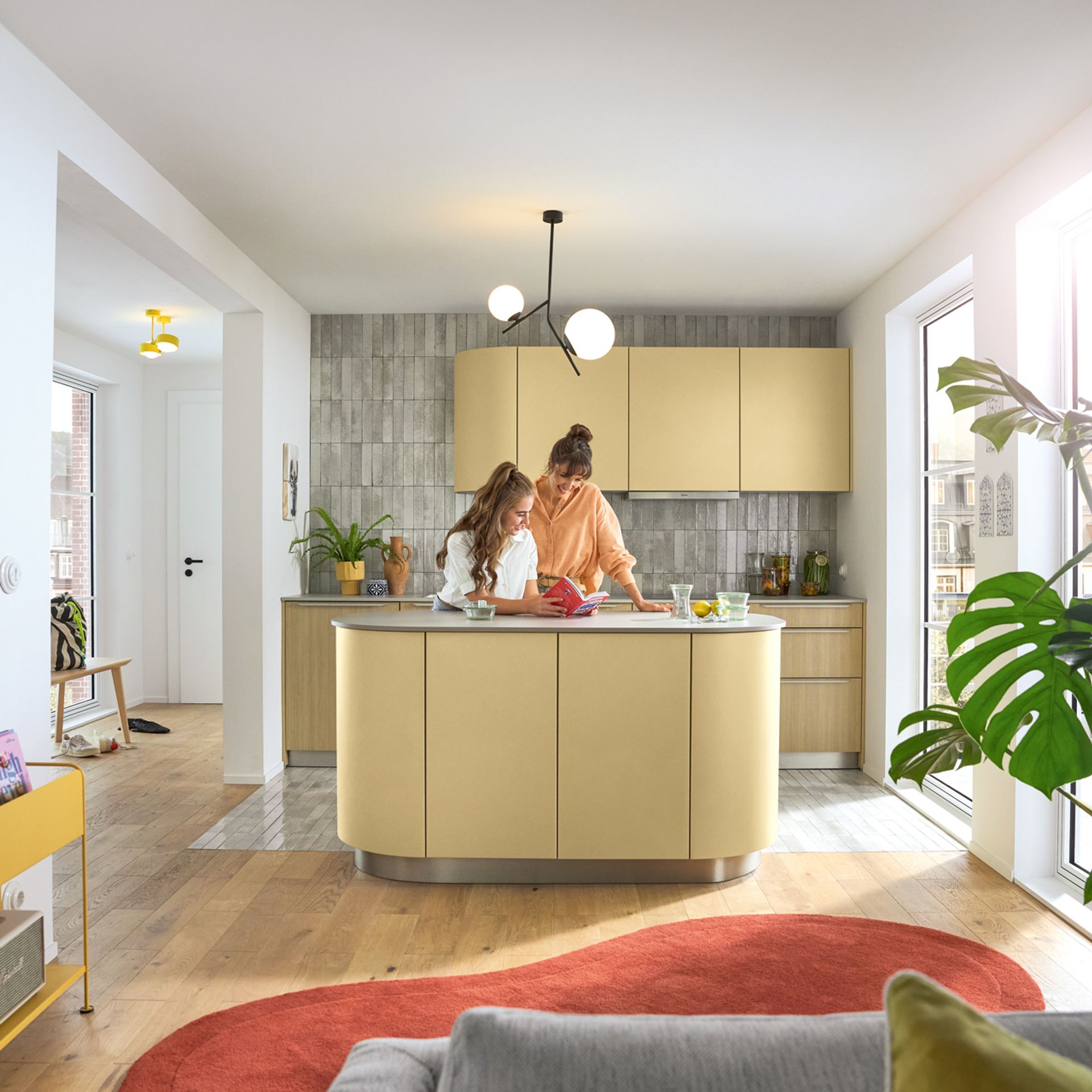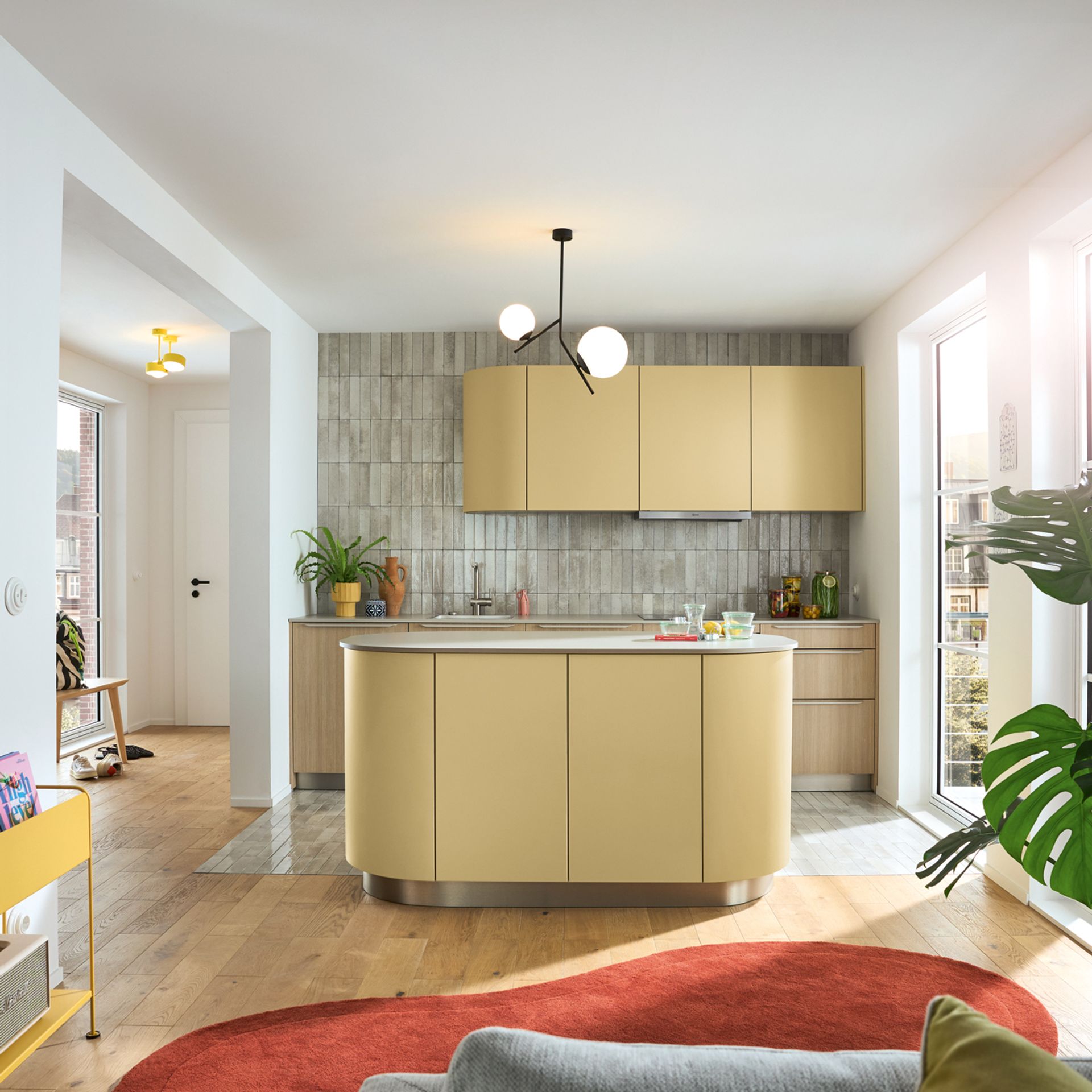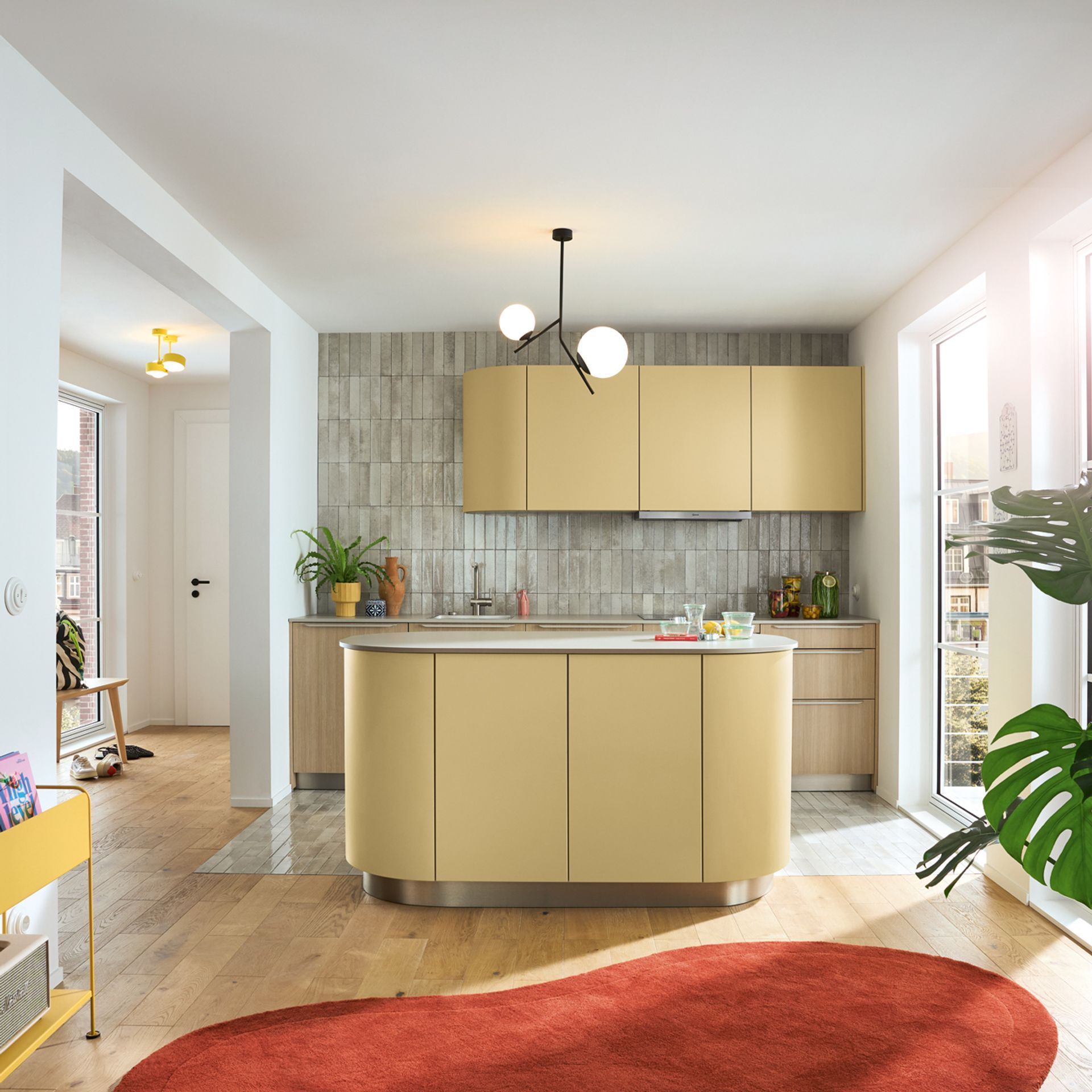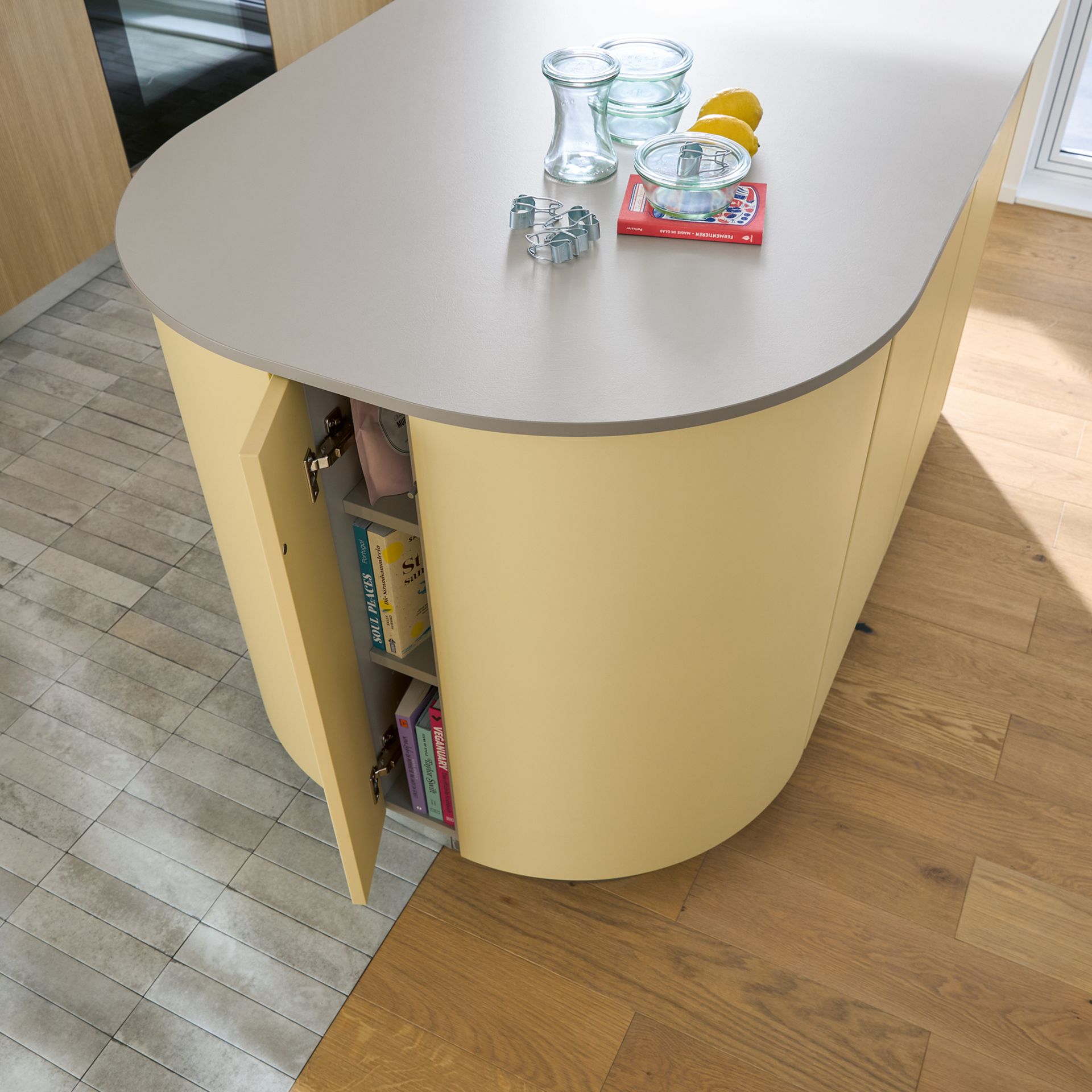 Vor allem in kleineren Küchen will Stauraum gut organisiert und maximal genutzt sein – optimal sind hier die abgerundeten Rondo-Schränke der Kücheninsel. Die intelligente, platzsparende Stauraumlösung fügt sich dank ihrer sanften Kurven elegant ein. Optische Harmonie schaffen die hellen sandgelben Fronten der Insel in Kombination mit den Rillenfronten in Eiche Natur. Diese bieten nicht nur ein einzigartiges Handgefühl, sondern sind auch mit funktionalen Eigenschaften ausgestattet, wie zum Beispiel hoher Widerstandsfähigkeit gegenüber Kratzern und extremen Temperaturen.