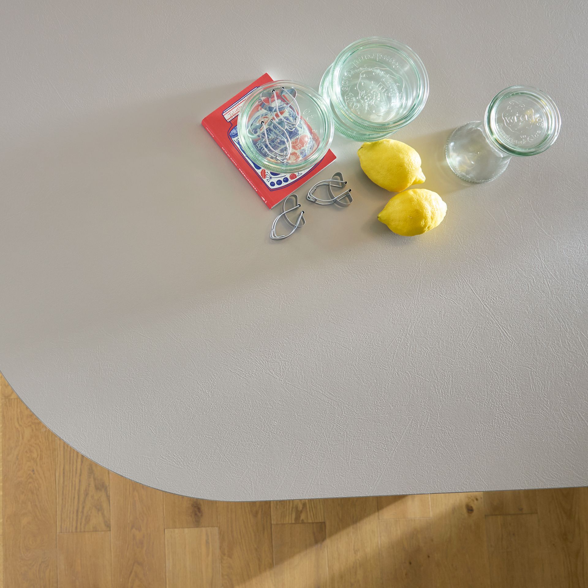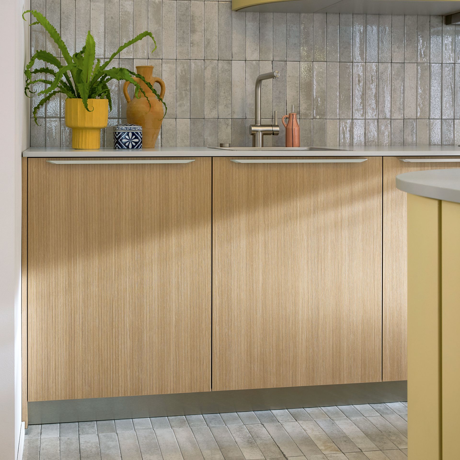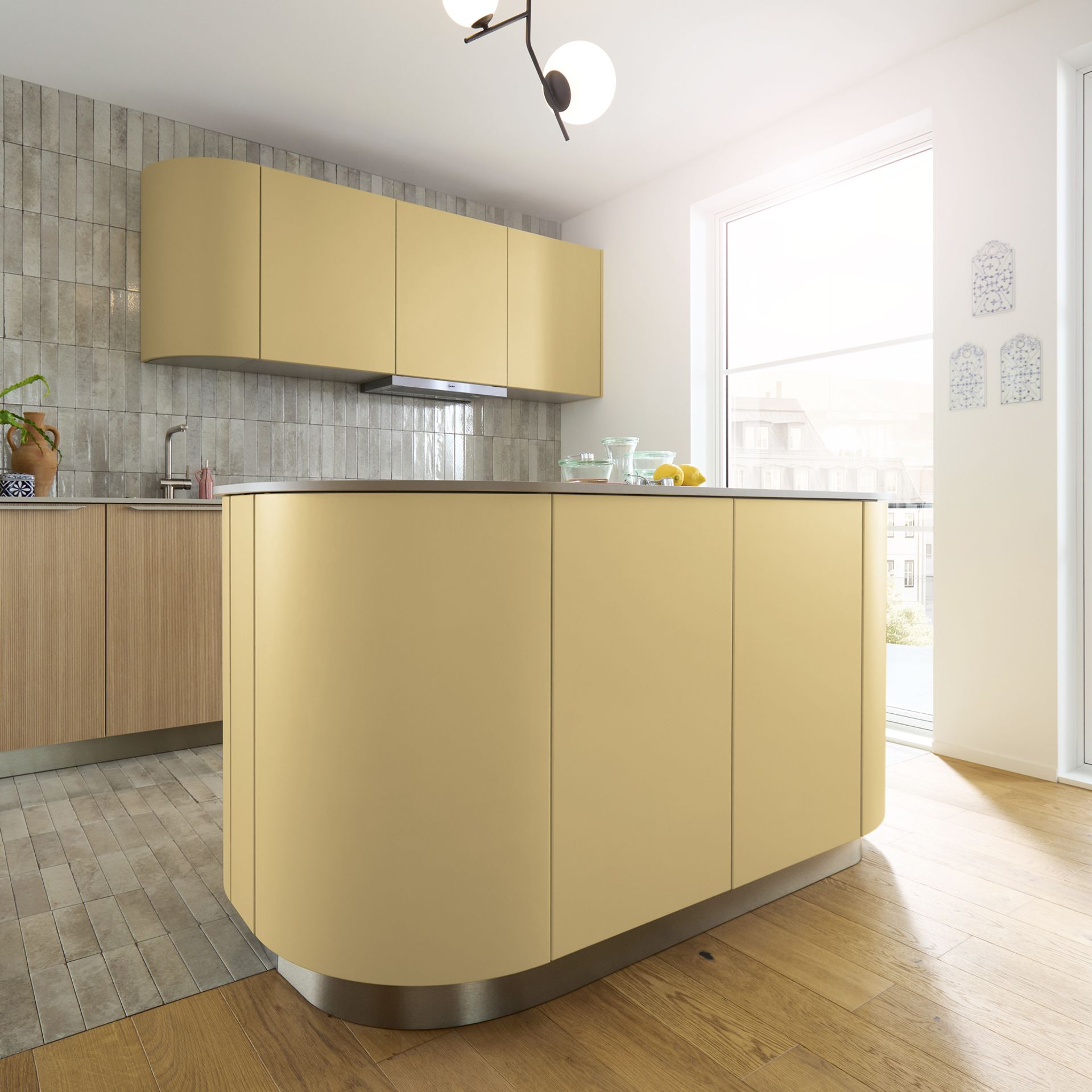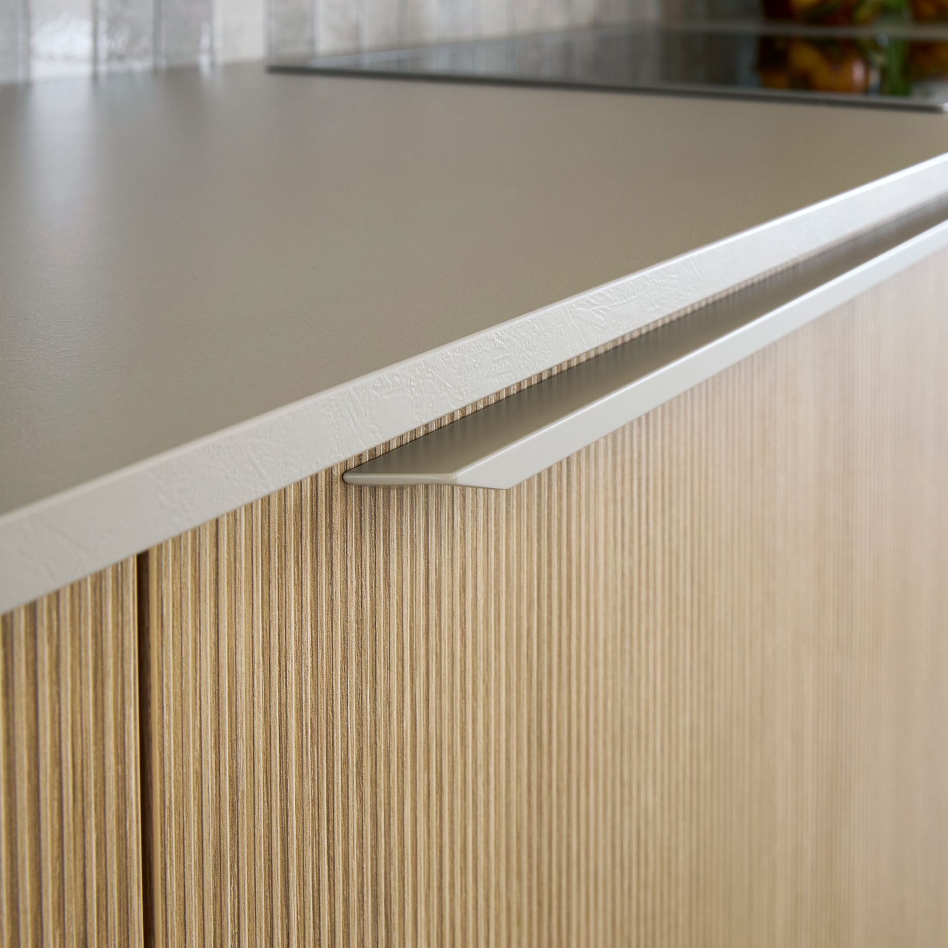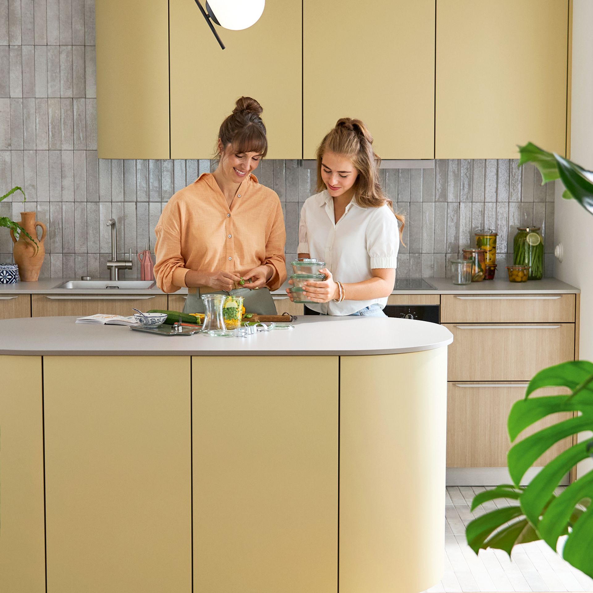 Vor allem in kleineren Küchen will Stauraum gut organisiert und maximal genutzt sein – optimal sind hier die abgerundeten Rondo-Schränke der Kücheninsel. Die intelligente, platzsparende Stauraumlösung fügt sich dank ihrer sanften Kurven elegant ein. Optische Harmonie schaffen die hellen sandgelben Fronten der Insel in Kombination mit den Rillenfronten in Eiche Natur. Diese bieten nicht nur ein einzigartiges Handgefühl, sondern sind auch mit funktionalen Eigenschaften ausgestattet, wie zum Beispiel hoher Widerstandsfähigkeit gegenüber Kratzern und extremen Temperaturen.