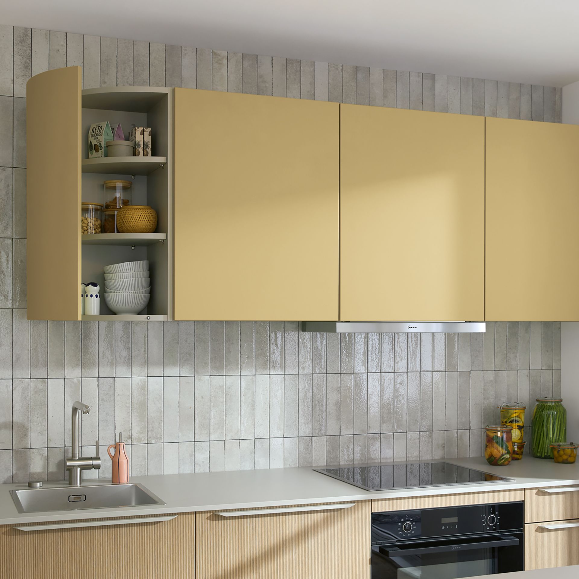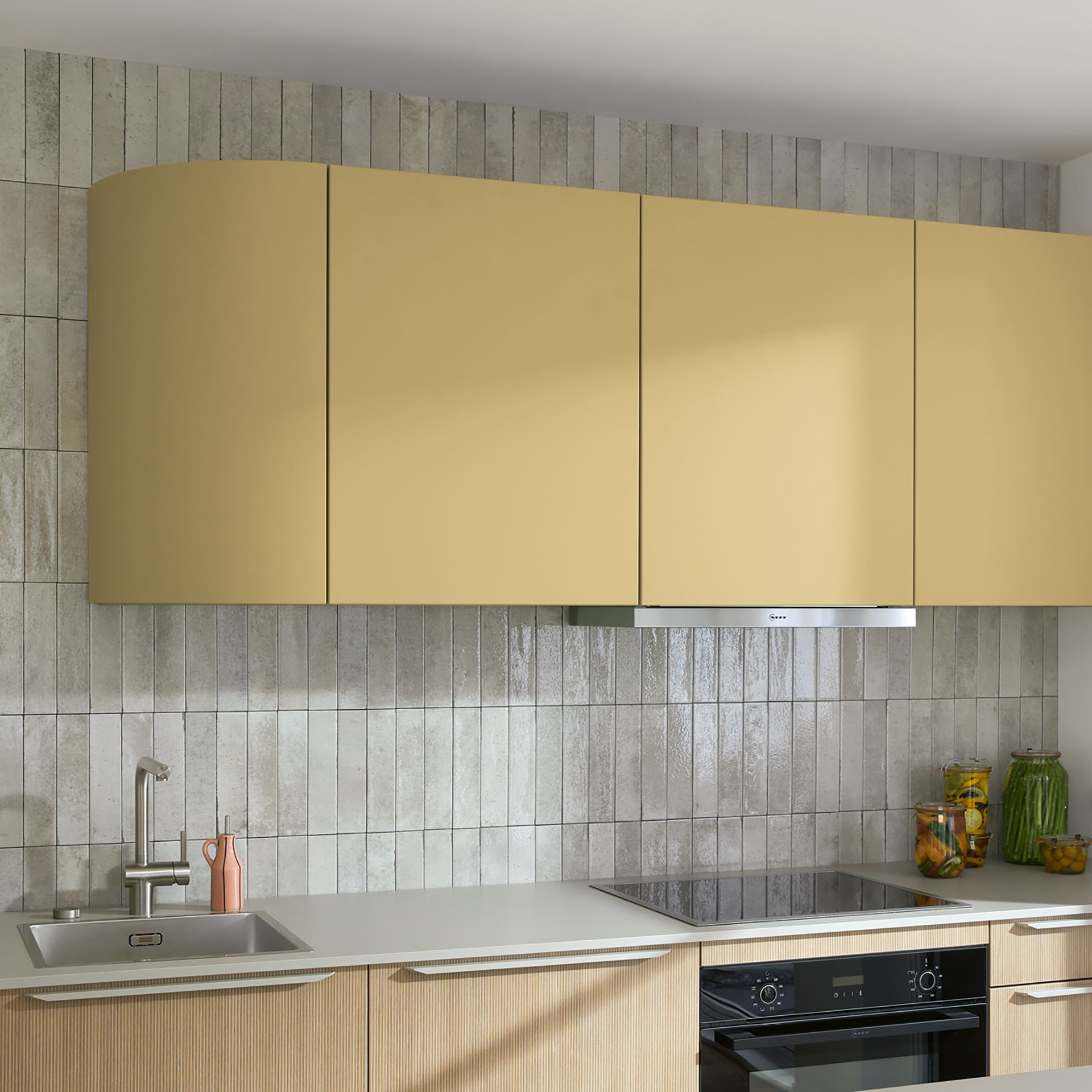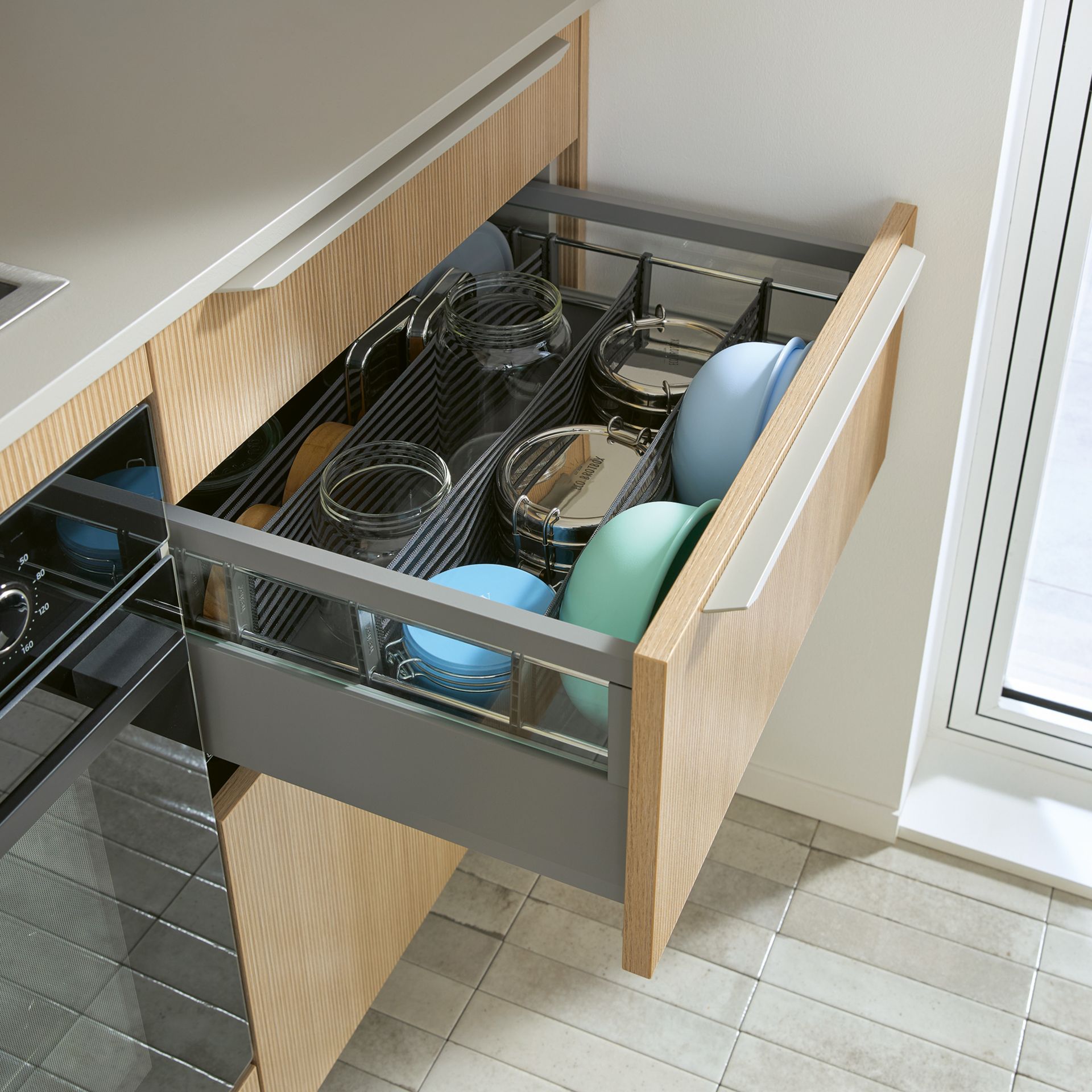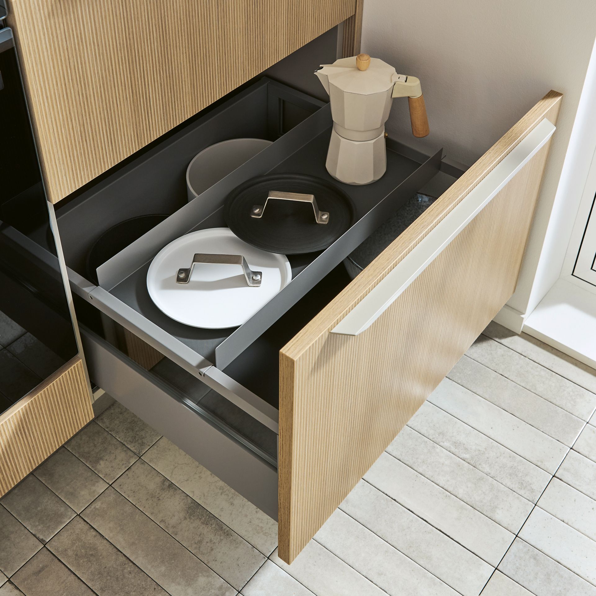 Vor allem in kleineren Küchen will Stauraum gut organisiert und maximal genutzt sein – optimal sind hier die abgerundeten Rondo-Schränke der Kücheninsel. Die intelligente, platzsparende Stauraumlösung fügt sich dank ihrer sanften Kurven elegant ein. Optische Harmonie schaffen die hellen sandgelben Fronten der Insel in Kombination mit den Rillenfronten in Eiche Natur. Diese bieten nicht nur ein einzigartiges Handgefühl, sondern sind auch mit funktionalen Eigenschaften ausgestattet, wie zum Beispiel hoher Widerstandsfähigkeit gegenüber Kratzern und extremen Temperaturen.